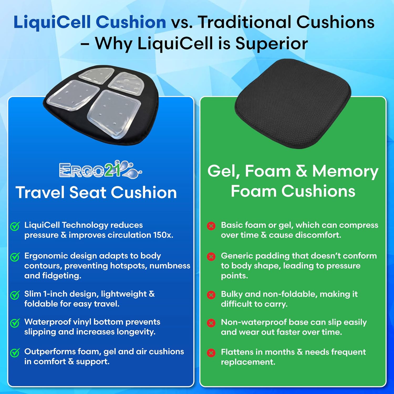 | Advanced LiquiCell Technology | Liquid-filled membranes reduce friction and shear, improving blood flow by up to 150% – something memory foam, gel, or air cushions can’t do. Unlike conventional cushions that compress and trap heat, LiquiCell Technology distributes pressure more evenly, protecting sensitive skin and underlying tissues. This helps prevent numbness, tingling, fatigue and even pressure sores during prolonged sitting. |